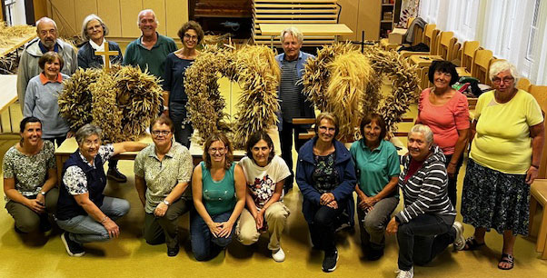 Die Kinder kamen am Tag darauf zusammen und banden die Erntesträußchen für die Festmesse am Sonntag. Da viele gekommen waren, waren wir schnell fertig. Viele Hände - rasches Ende. Zum Schluss gabs noch eine Süßigkeit als Dankeschön.